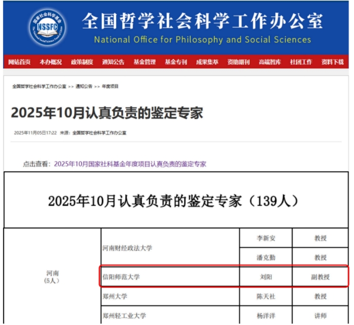 近日,全国哲学社会科学工作办公室网站公布了2025年10月“认真负责的鉴定专家”名单,我校历史文化学院刘阳副教授名列其中。本次表彰的“认真负责的鉴定专家”全国共计139人,河南省仅有5名专家入选。刘阳副教授为我校唯一入选者,也是我校在职教师首次获评该荣誉称号。