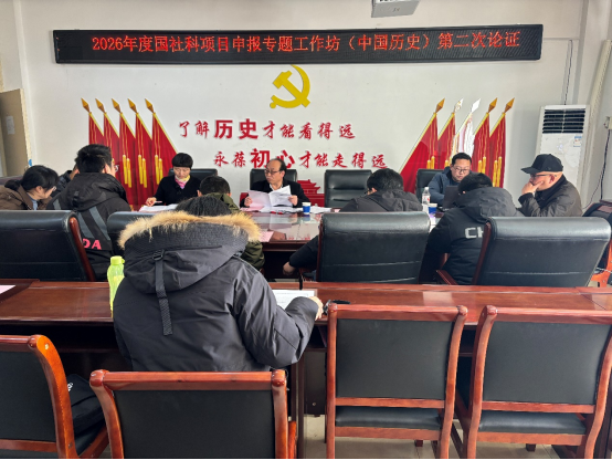 为扎实推进国社科项目申报工作,增进学术交流,1月12日历史文化学院举行2026年度国社科项目申报工作坊(中国历史)第二轮论证会。本次会议邀请我校文学院张振龙教授、淮河校区人文学部李蕊教授和武汉大学历史学院姚磊副教授莅临指导。历史文化学院、旅游学院12位教师参加研讨。会议由工作坊召集人张乐锋副教授主持。