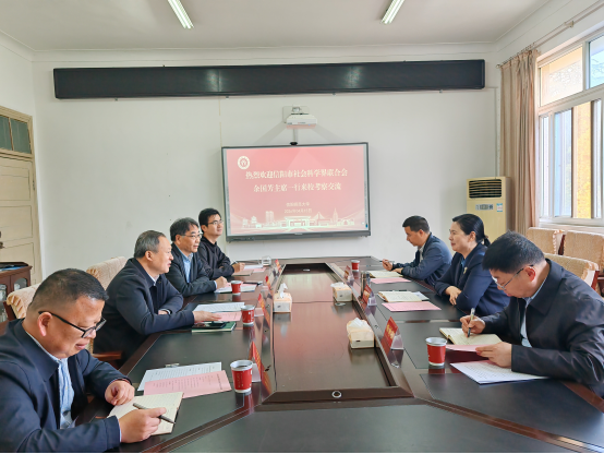 4月15日上午,信阳市社会科学界联合会主席余国芳一行来校考察交流,围绕深化市校协同合作、筹办信阳市社会科学界纪念习近平总书记《在哲学社会科学工作座谈会上的讲话》发表十周年学习研讨活动、推动哲学社会科学更好服务“两个更好”实践和现代化强市建设等进行深入会商。信阳市社会科学界联合会副主席杨刻俭、秘书长何洪涛,信阳师范大学副校长涂友超,优秀社科专家代表尹全海教授,学校社会科学处处长吕东亮、副处长俞彤晖等参加座谈。座谈会在学校综合办公楼417会议室举行,由吕东亮主持。